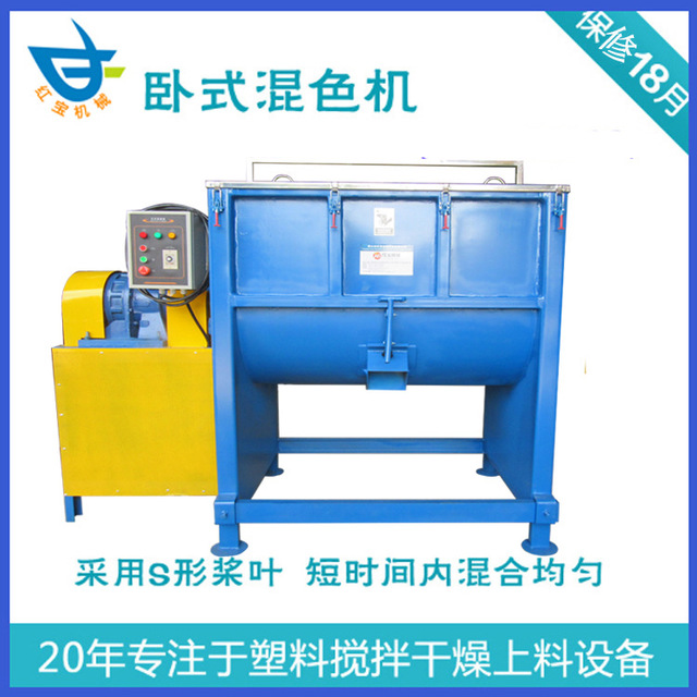 1000KG大型臥式混色機吸收了國內外粉體混合設備先進技術經驗,經紅寶產品研發部歷時三年改進而成,工藝精良,先進切割、焊接技術,堅固耐用,它與以往的立式攪拌機、臥式U型攪拌機不同,采用臥式圓筒結構,維修率大大降低,攪拌不留死角,均勻度大幅度提高,混合時間縮短至5-8分鐘,節能更高效,具有以下顯著優勢: